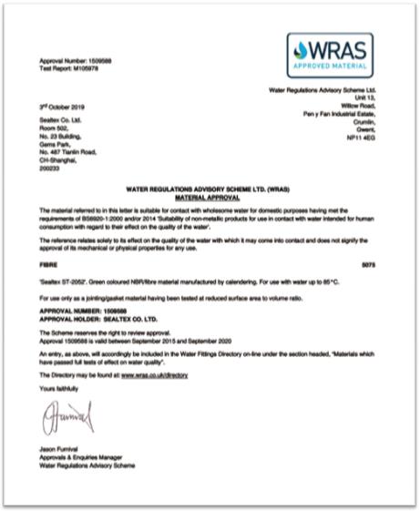 我司ST-2052無石棉板獲得了英國飲用水WRAS的認證。